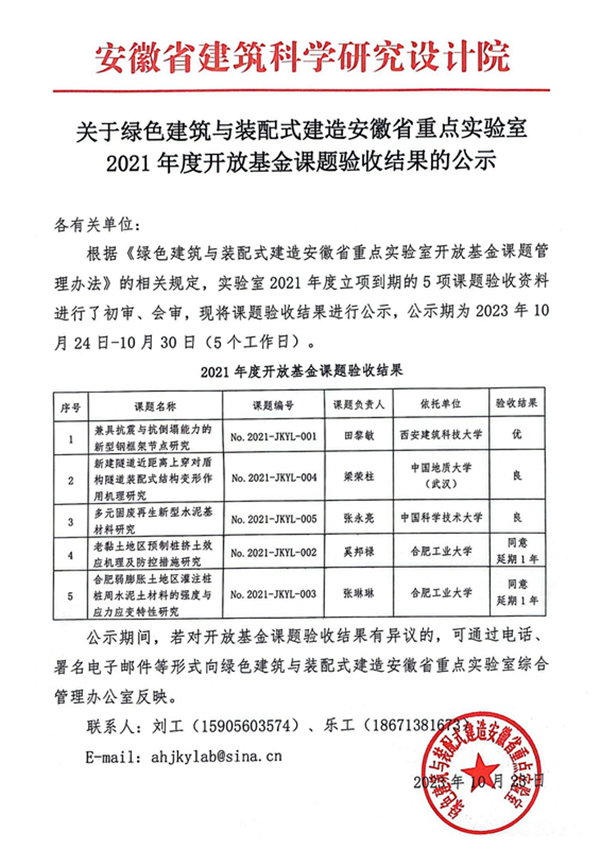 關(guān)于綠色建筑與裝配式建造安徽省重點實驗室2021年度開放基金課題驗收結(jié)果的公示