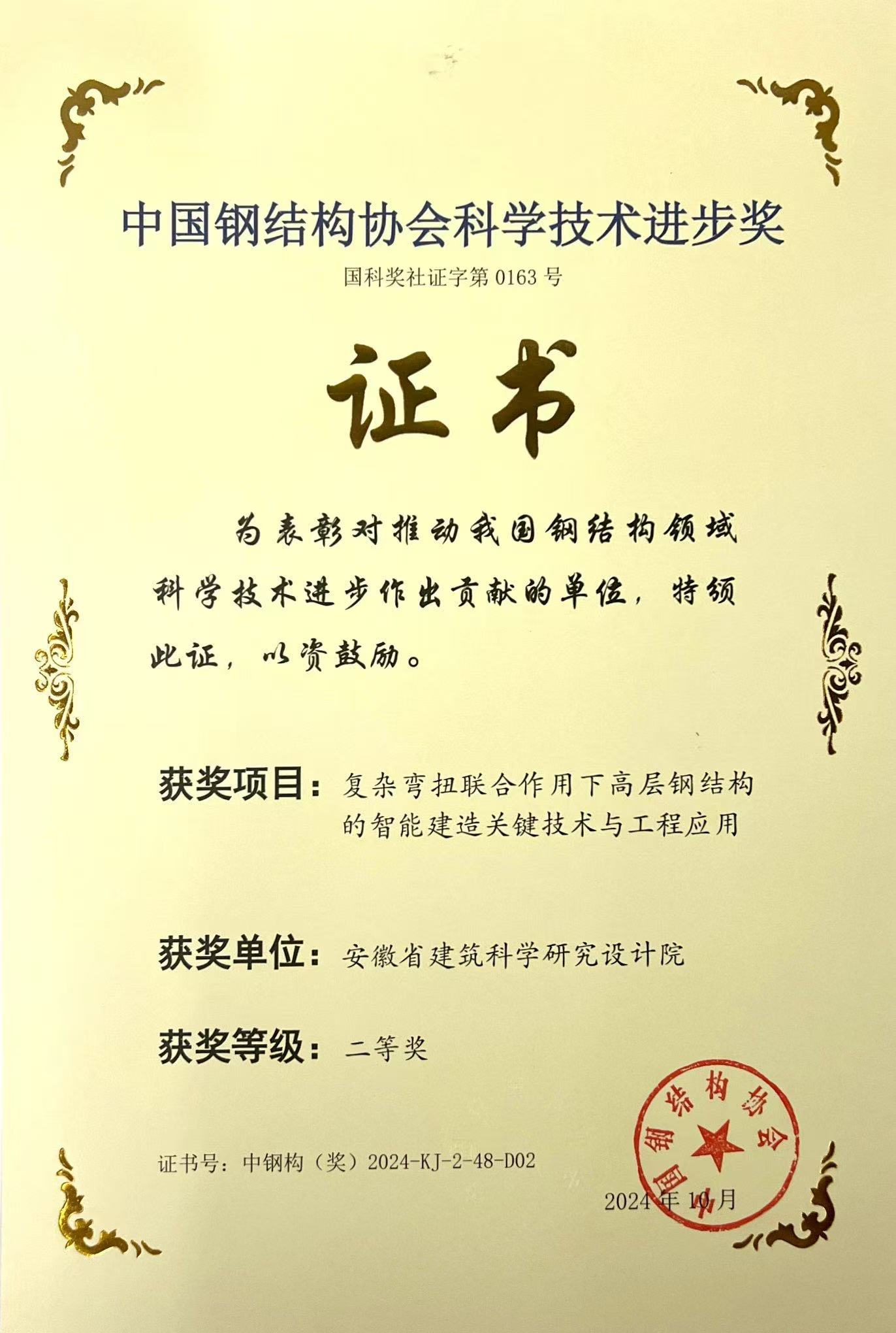 近日,2024年度中國鋼結(jié)構(gòu)協(xié)會(huì)科學(xué)技術(shù)進(jìn)步獎(jiǎng)授獎(jiǎng)結(jié)果揭曉,安徽建科牽頭參與完成的“復(fù)雜彎扭聯(lián)合作用下高層鋼結(jié)構(gòu)的智能建造關(guān)鍵技術(shù)與工程應(yīng)用”項(xiàng)目科研成果榮獲中國鋼結(jié)構(gòu)協(xié)會(huì)科學(xué)技術(shù)進(jìn)步獎(jiǎng)二等獎(jiǎng)。