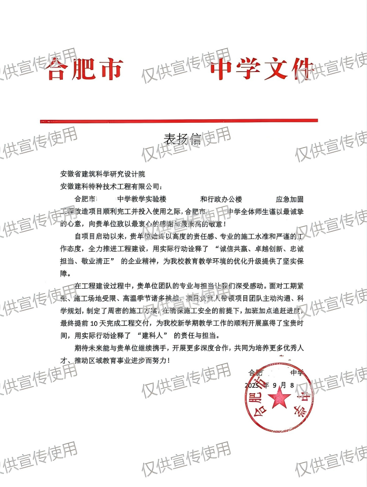 近日,我院及所屬子公司建科特技收到來自合肥市某中學(xué)的表揚(yáng)信,對我院在該校教學(xué)實(shí)驗(yàn)樓和行政辦公樓應(yīng)急加固糾偏項(xiàng)目中的卓越表現(xiàn)予以高度肯定和誠摯感謝。