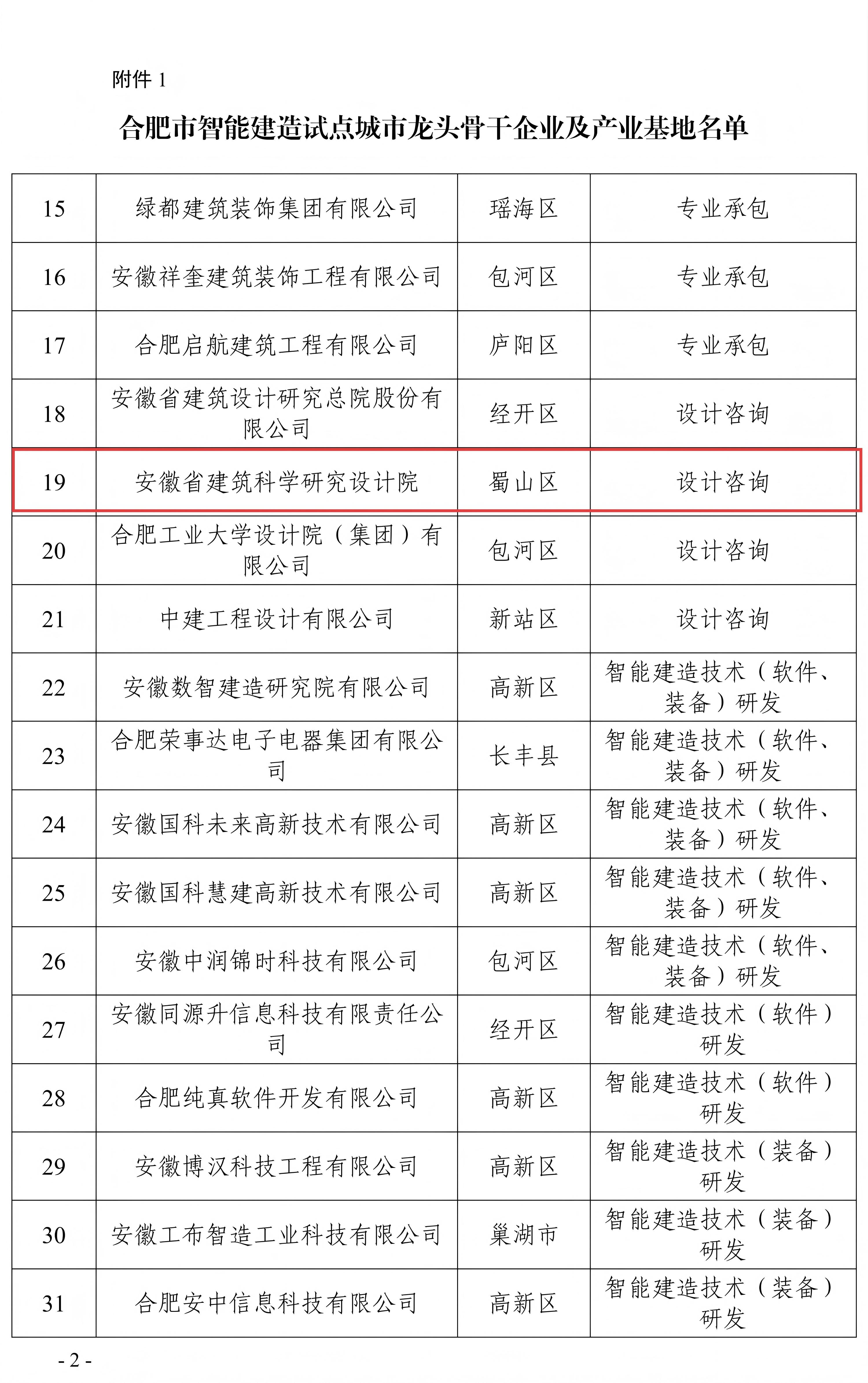 近日,合肥市城鄉(xiāng)建設(shè)局發(fā)布了《關(guān)于公布合肥市智能建造試點(diǎn)城市龍頭骨干企業(yè)、產(chǎn)業(yè)基地及關(guān)鍵技術(shù)產(chǎn)品清單的通知》,我院憑借在建筑智能建造等前沿領(lǐng)域的核心競(jìng)爭(zhēng)力獲評(píng)“合肥市智能建造試點(diǎn)城市龍頭骨干企業(yè)、產(chǎn)業(yè)基地”稱號(hào)。