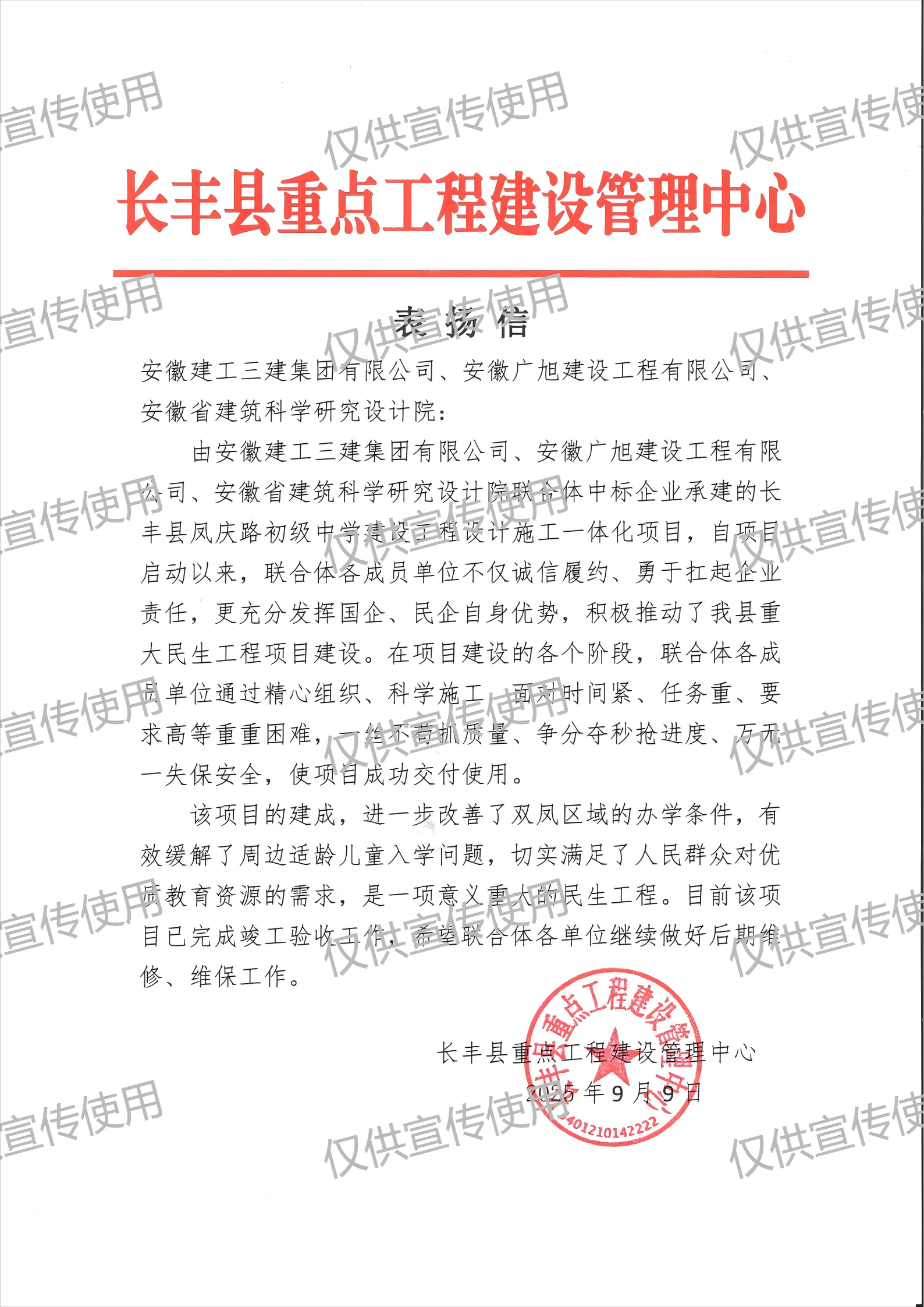 近日,我院收到來(lái)自長(zhǎng)豐縣重點(diǎn)工程建設(shè)管理中心的表?yè)P(yáng)信,信中對(duì)我院在長(zhǎng)豐縣鳳慶路初級(jí)中學(xué)建設(shè)工程設(shè)計(jì)施工一體化項(xiàng)目中的專業(yè)表現(xiàn)與責(zé)任擔(dān)當(dāng)給予肯定和贊賞。
